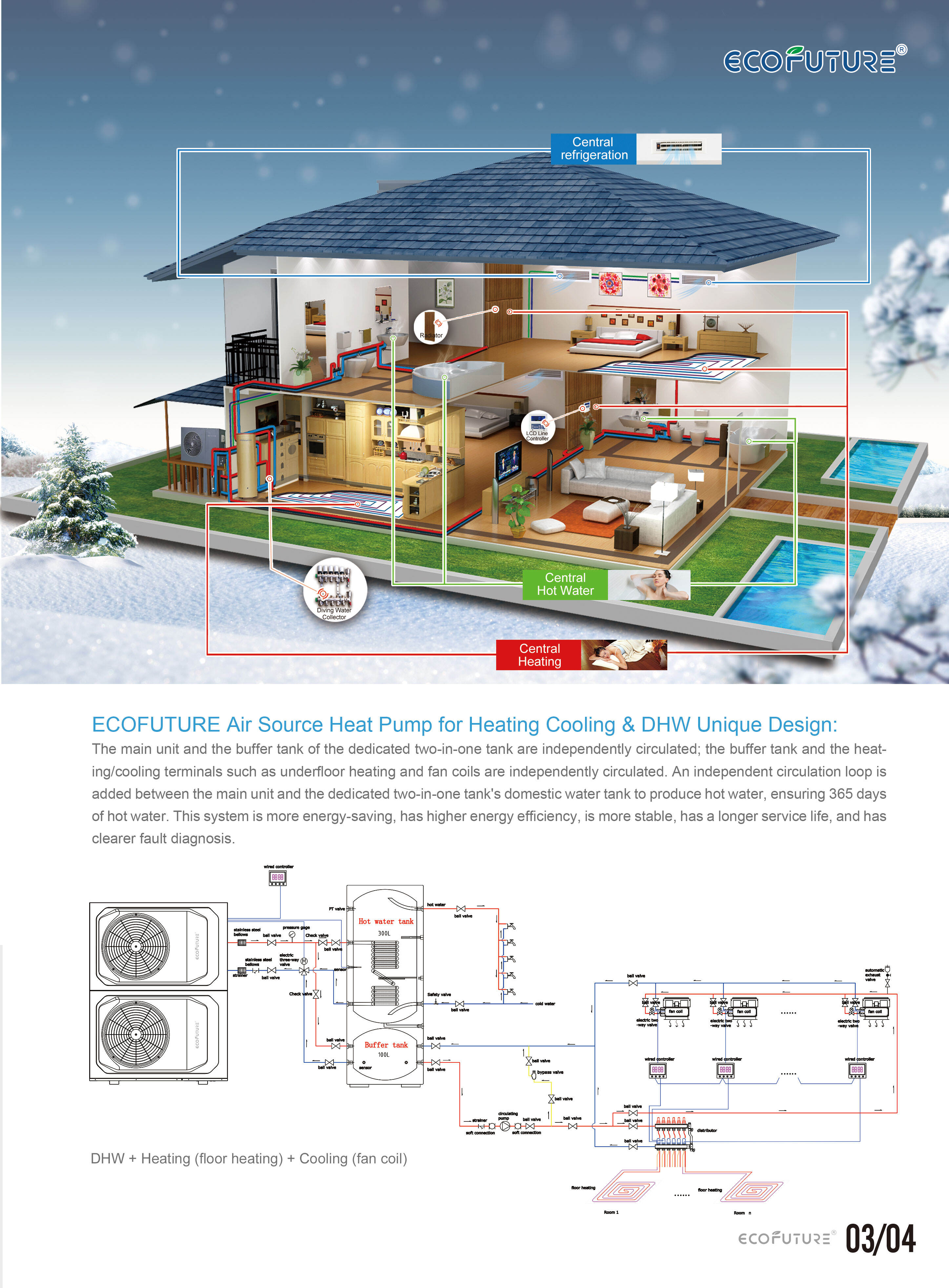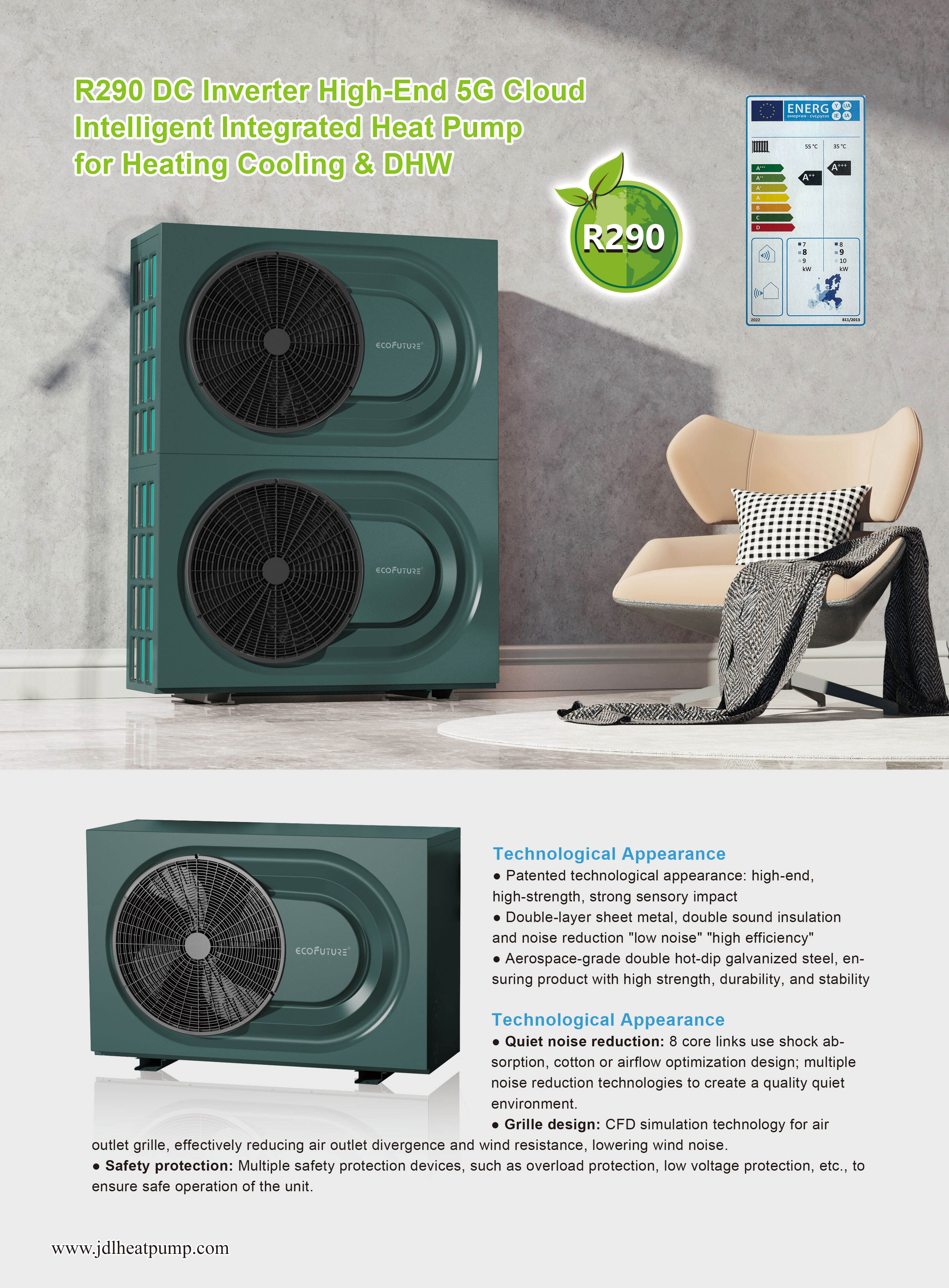 Die JIADELE Multifunktion-Wärmepumpe ist nicht nur funktional, sondern auch optisch ansprechend mit einem schlichten und modernen Design. Sie wird aus hochwertigen Materialien hergestellt, um Dauerhaftigkeit und Langlebigkeit sicherzustellen, was sie zu einer weisen Investition macht. Das System verfügt über fortschrittliche Technologie, die es ermöglicht, die richtige Menge an Wärme, kalter Luft und heißem Wasser bereitzustellen, ohne übermäßig belastet oder beschädigt zu werden.